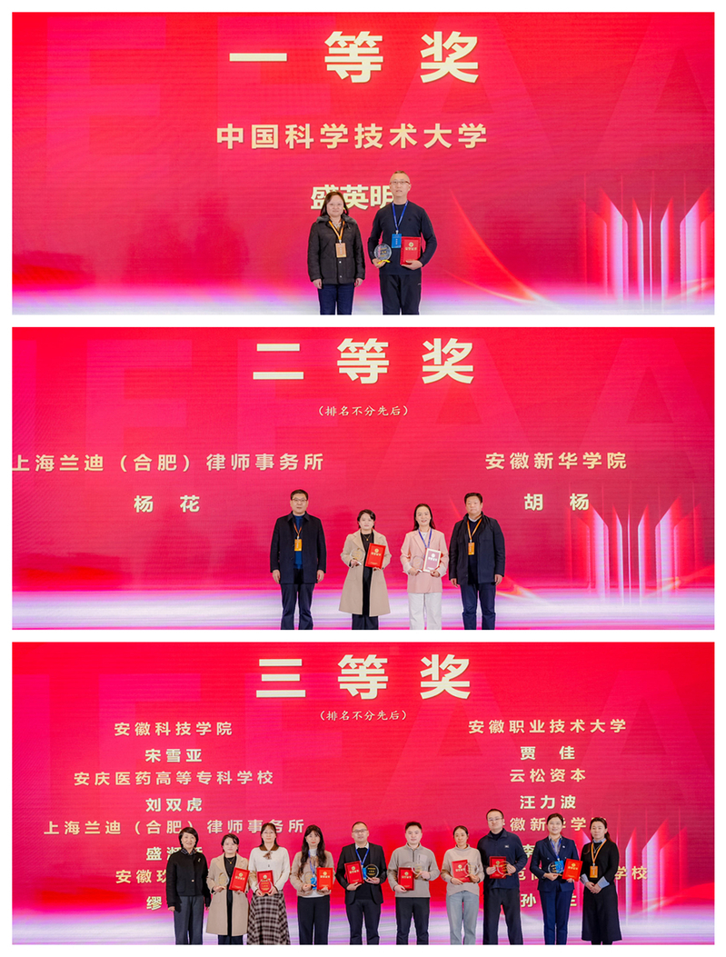 经现场评定,中国科学技术大学盛英明获得一等奖,上海兰迪(合肥)律师事务所杨花、安徽新华学院胡杨获得二等奖,安徽科技学院宋雪亚、安徽职业技术大学贾佳、安庆医药高等专科学校刘双虎、云松资本汪力波、上海兰迪(合肥)律师事务所盛湉湉、安徽新华学院李薇薇、安徽玖通融创缪保家、桐城师范高等专科学校孙兰兰获得三等奖。在颁奖典礼上,评审专家为获奖选手颁发证书与奖杯,现场阵阵掌声,将活动氛围推向高潮。